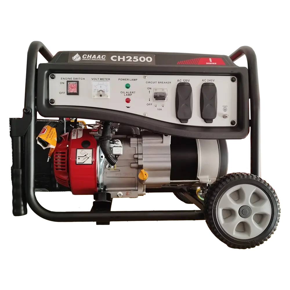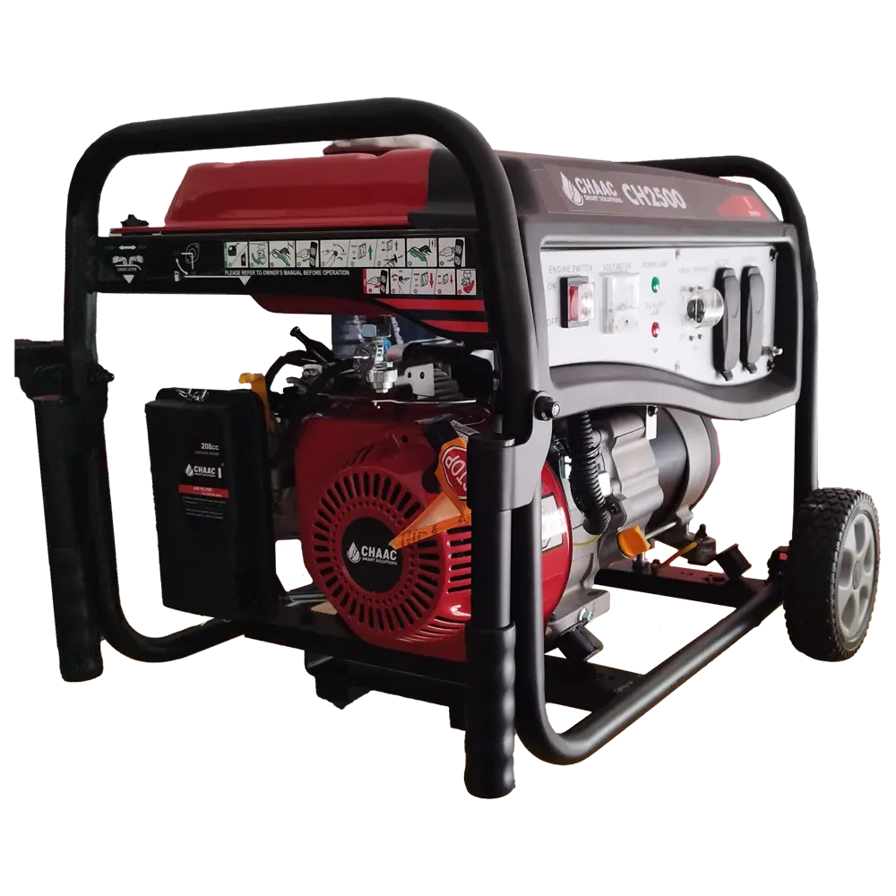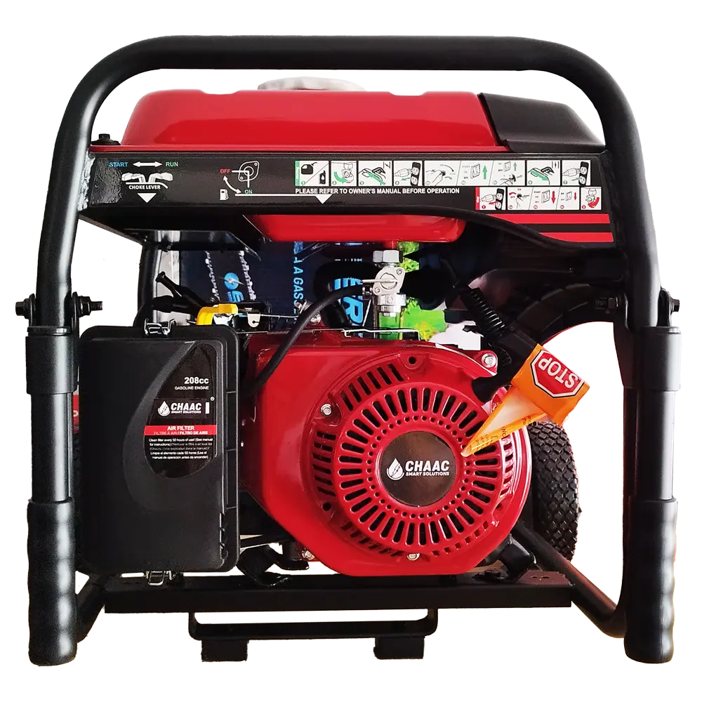 Generador portátil, cuenta con ruedas y agarradera para facilitar su transporte, tablero para clavija americana, incluye clavijas.